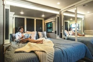 Another luxury fifth wheel, the Mobile Suites 41RKDB is the ultimate 2-bathroom couples’ RV. The primary suite features a king-sized bed, a huge full bathroom with double vanities, and a large walk-in closet in the nose of the 5th wheel.