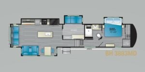 Another rear loft floorplan from Heartland is the Milestone 386BH. Like the Corterra model, this RV also has a rear bathroom. In this model, the loft is over the bathroom.