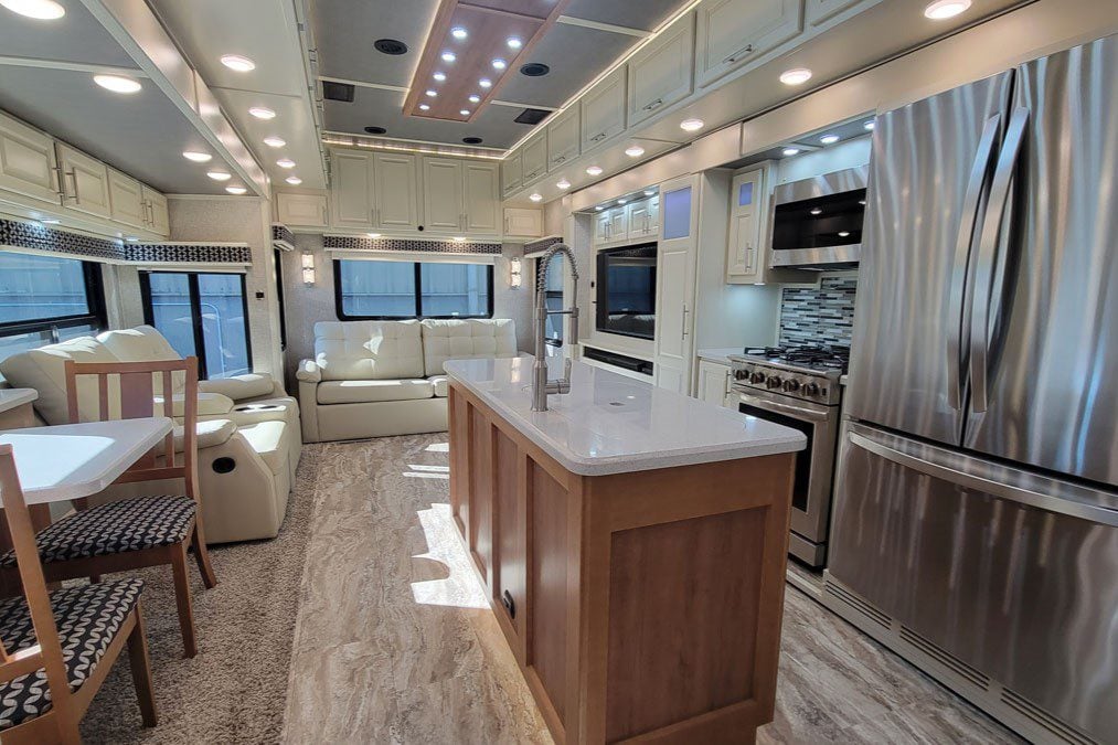 The most luxurious fifth wheels are fully customized rigs manufactured by Space Craft. Customers work with the company’s team to design a complete custom build specifically tailored to their needs and desires.