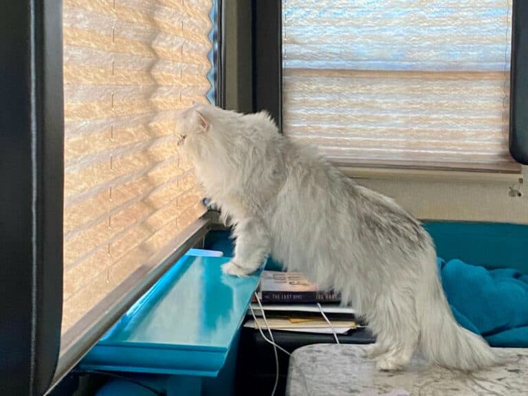 If you are new to RV travel with cats, see our complete guide to RV living with cats for more tips and tricks to make camping with cats easier. We have lived and traveled in our RV for over five years, and our cat, Mr. Man, loves being in our fifth wheel.