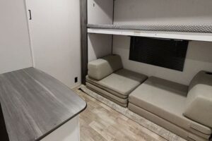 The 3515 office was also designed to be flexible. There are washer and dryer hookups under the desk and an entry door, so the room can also serve as a laundry and mudroom. The desk raises up, so campers can utilize the 60×70 inches of usable floor space.