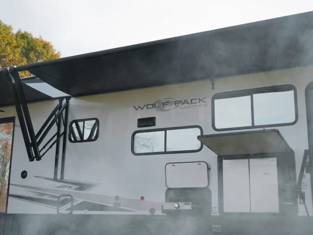 The only toy hauler on our list of the best RVs with outdoor kitchens is the Forest River Cherokee Wolf Pack. This line of fifth wheel toy haulers starts at 32 feet. All of the floorplan options include a rear garage with ramp doors that can be converted into patios.