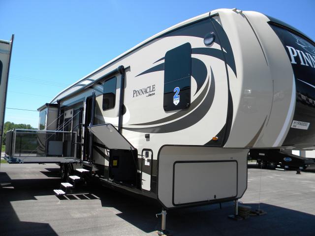 Brinkley’s toy haulers have great porches, but they also make the Model Z 3400, a fifth wheel with an awesome back patio but no garage. The porch does fold up, so the RV is fully enclosed for travel.