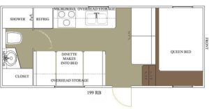 Like the Scamp fifth wheel, the Allen Camper 199RB has a lofted queen-sized bed in the nose and a dinette that converts into a bed. This floorplan also includes a full three-piece bathroom with a storage closet in the rear of the RV.