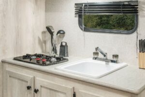 Another great small toy hauler RV is the Forest River Wildwood FX 175RTK. The Wildwood has a full three-piece dry bathroom.