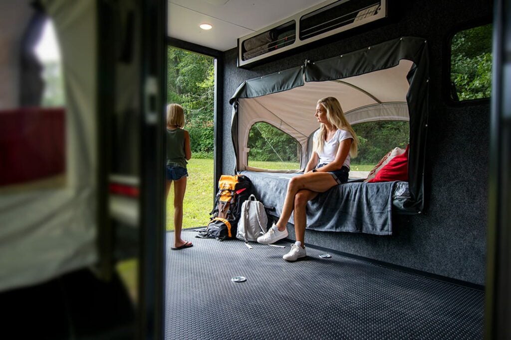 Another small toy hauler designed for adventure is the InTech Flyer Discover. A soft tip-out houses the bed, and an optional second tip-out can provide additional sleeping space.