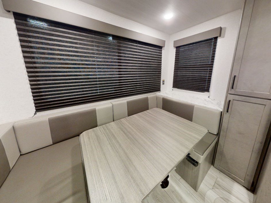 The floorplan also includes a large convertible dinette in the front of the RV, a loveseat sofa, and a large storage closet beside the entrance. The flooring is all vinyl with no carpet. This rig also comes prepped for solar panels.